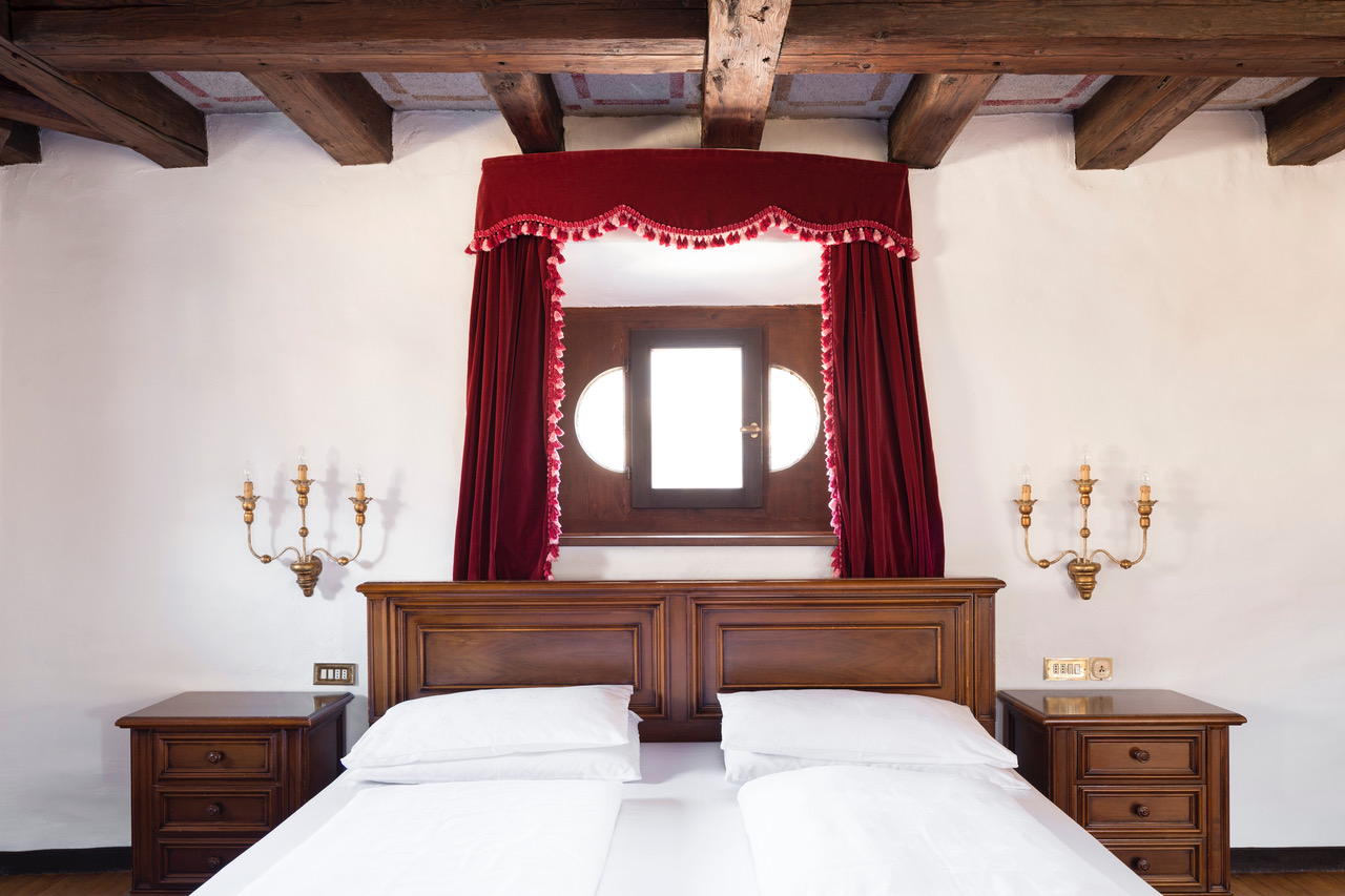 Im höchsten Turm des Schlosses, erreichbar nur über eine Wendeltreppe, liegt eine unserer schönsten und romantischsten Suiten: Die Turmsuite mit herrlichem Rundum-Blick über die Dächer der Kurstadt Meran und das Meraner Land. Die elegante, authentische Suite ist das perfekte Liebesnest für alle, die ihre Liebe auf ganz besondere Weise feiern wollen.