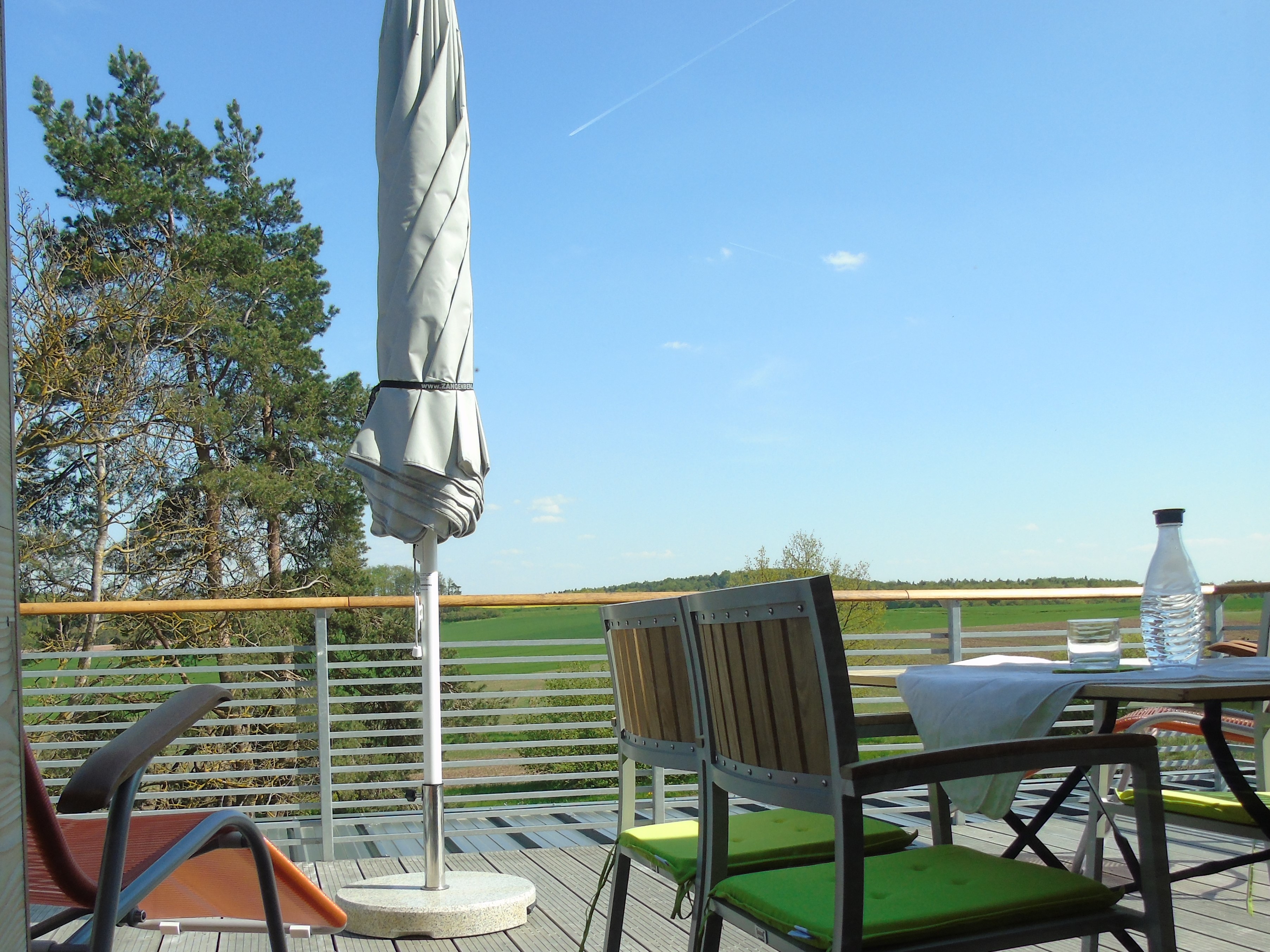 Helles Design-Apartment für 1-2 Gäste auf 52 qm Wohnfäche plus 22 qm Balkon in Richtung Sonnenaufgang, mit der unbestritten schönsten Aussicht, die das Haus zu bieten hat: Auf den Garten mit Schwimmteich und in die freie Natur mit Wiesen, Feldern und Wäldern.