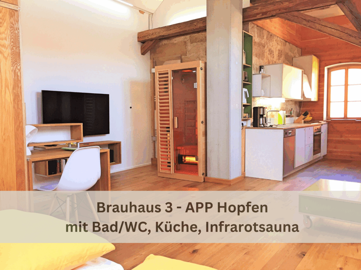 Großzügiges Wohnen für 1-2 Gäste auf 55 qm im OG des Hauses. Parkettboden aus fränkischer Eiche, voll ausgestattete Küche Marke Eichenfrau und Essecke. Daran angrenzende Kuschel-Ecke mit Ledersofa und großem TV-Flatscreen. Offener Schlafraum mit Eichenfrau-Bett 180x200 cm und Bettwäsche in Übergröße.