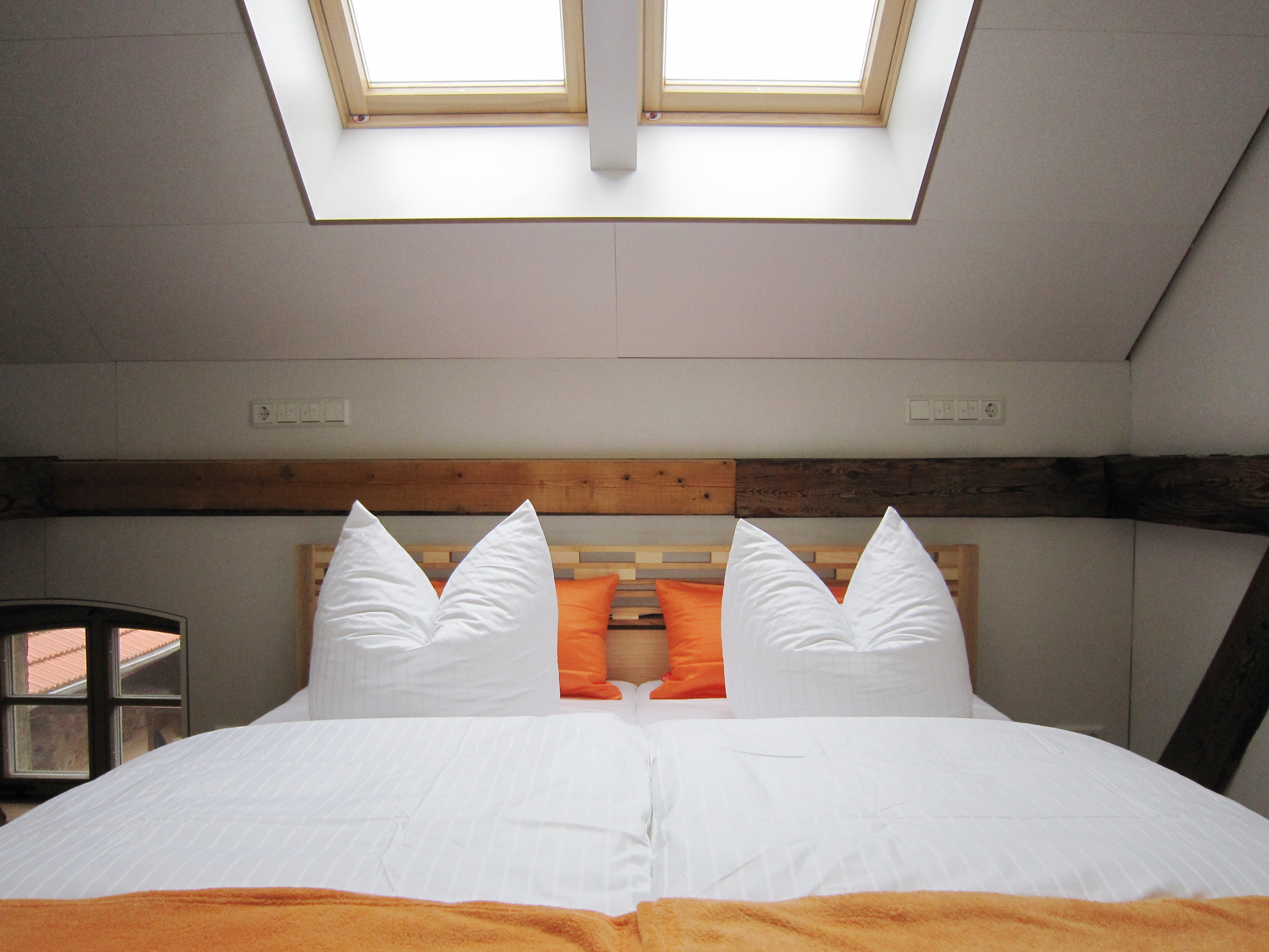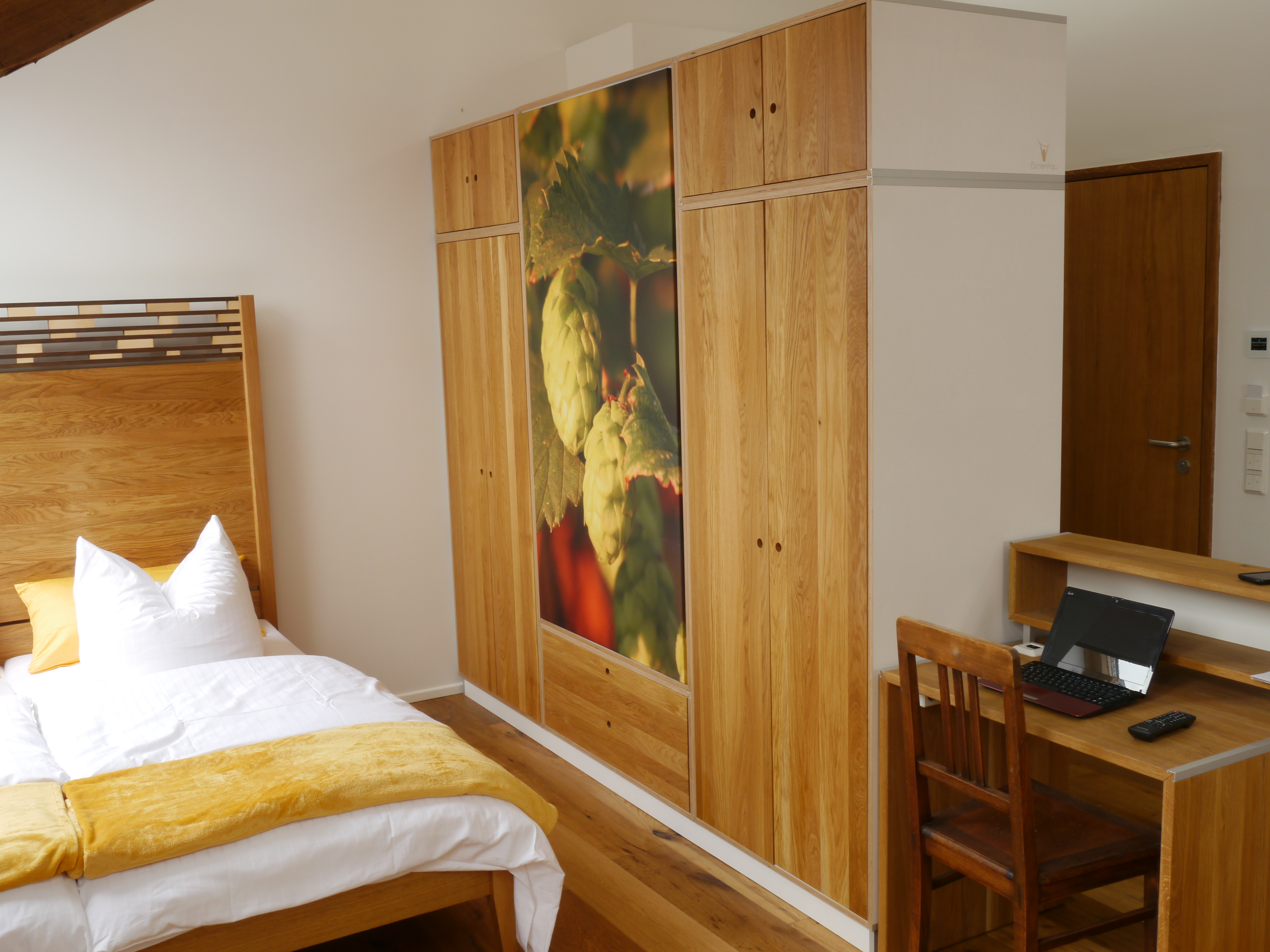 Für bis zu 2 Gäste, 22 qm, im OG. Echter Eichen-Parkettboden, Naturholz-Doppelbett 180x200cm mit Bettwäsche in Übergröße. Integriertes, modernes Raum-im-Raum-Bad der Marke Eichenfrau mit Dusche/WC. Keine Klimaanlage!