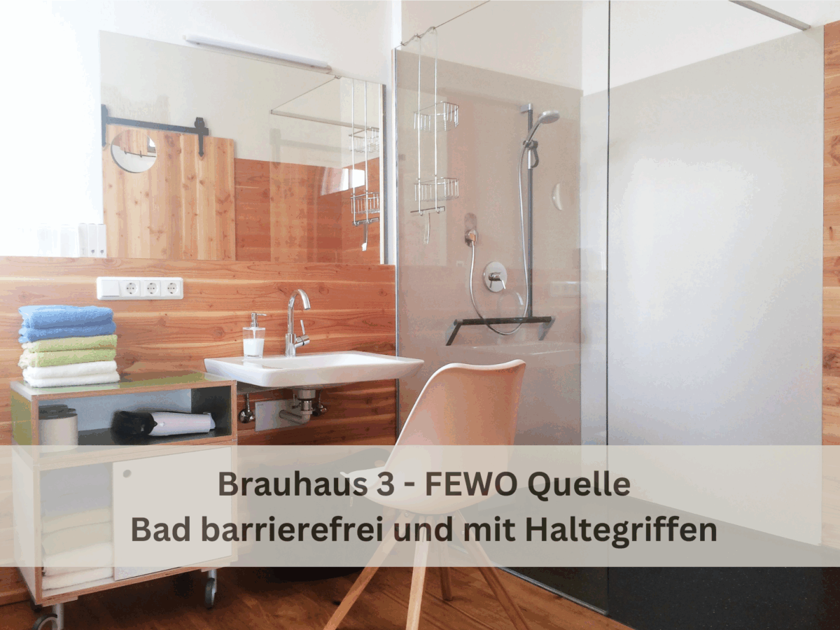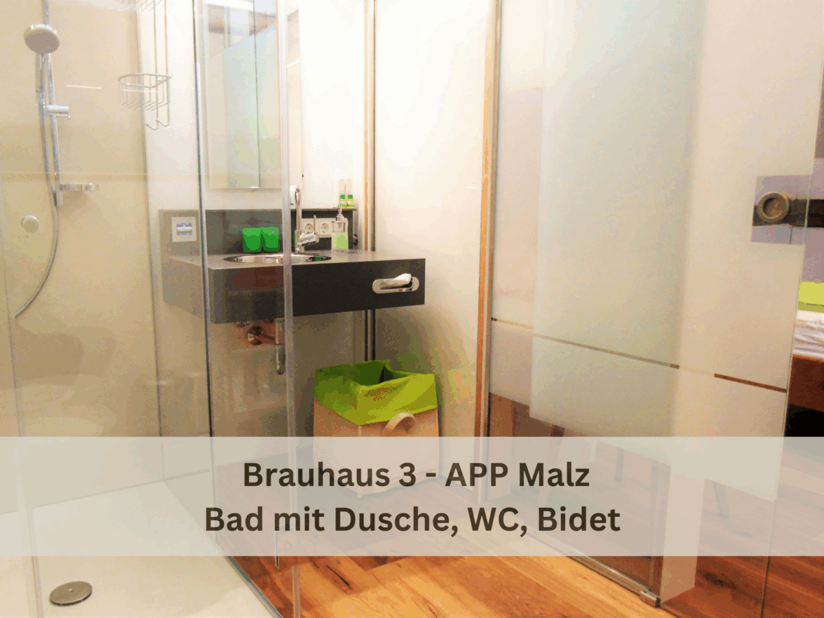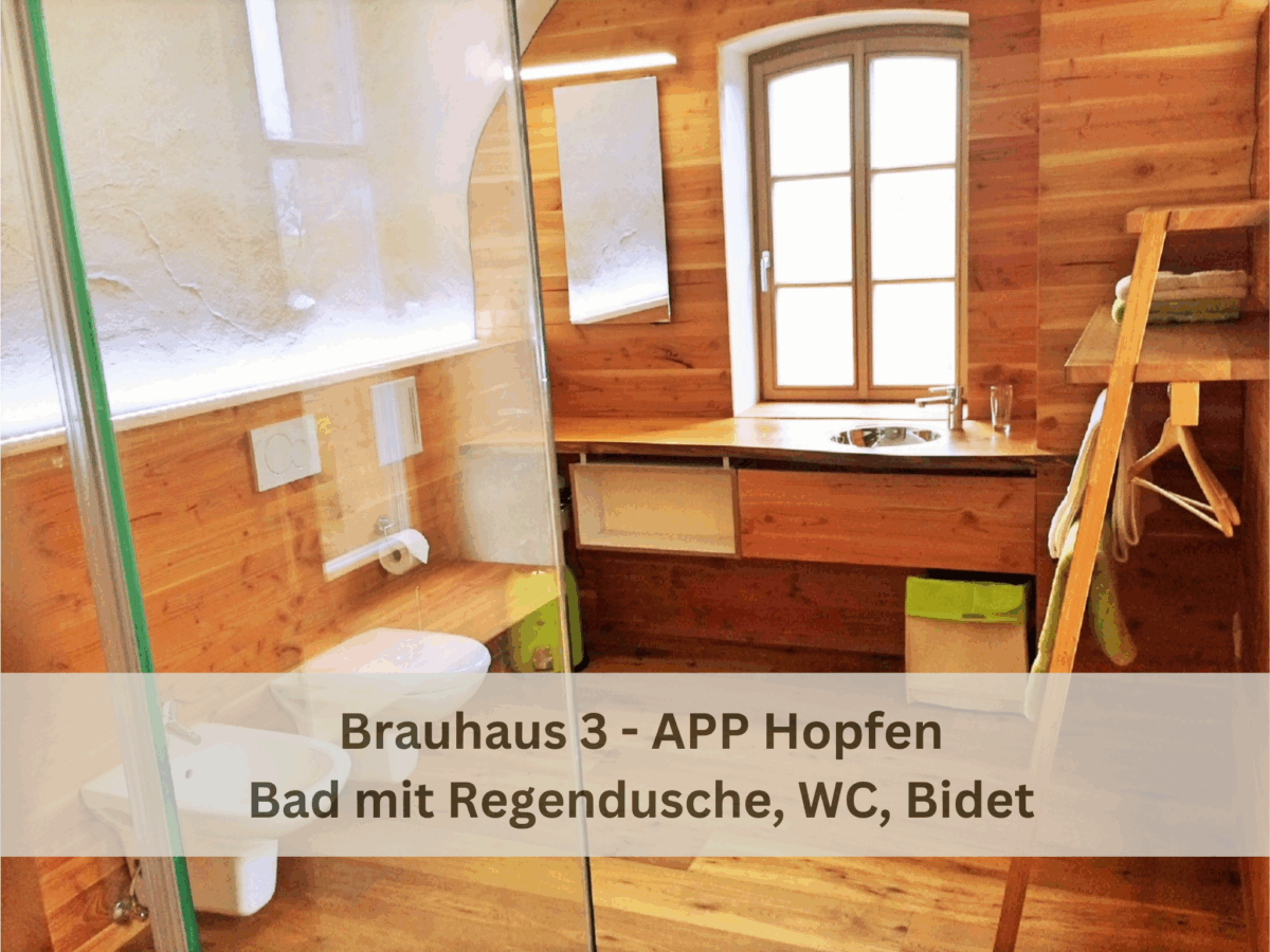 Tageslichtdurchflutetes, großes Badezimmer in der ehemaligen Darre des Brauhauses, mit begehbarer Regen-Dusche, WC und Bidet. Neu: Eigene Infrarotsauna im Apartment und Klimaanlage!