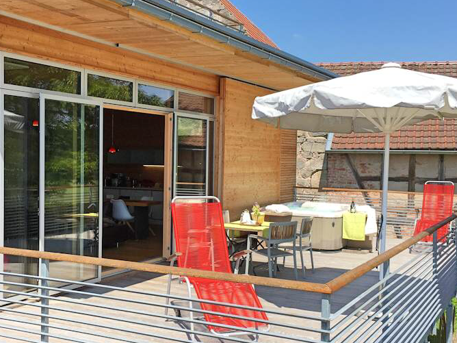 Genießer-Ferienwohnung mit Jacuzzi, Kaminofen, Balkon und direktem Zugang zum Garten. Barrierefrei!
