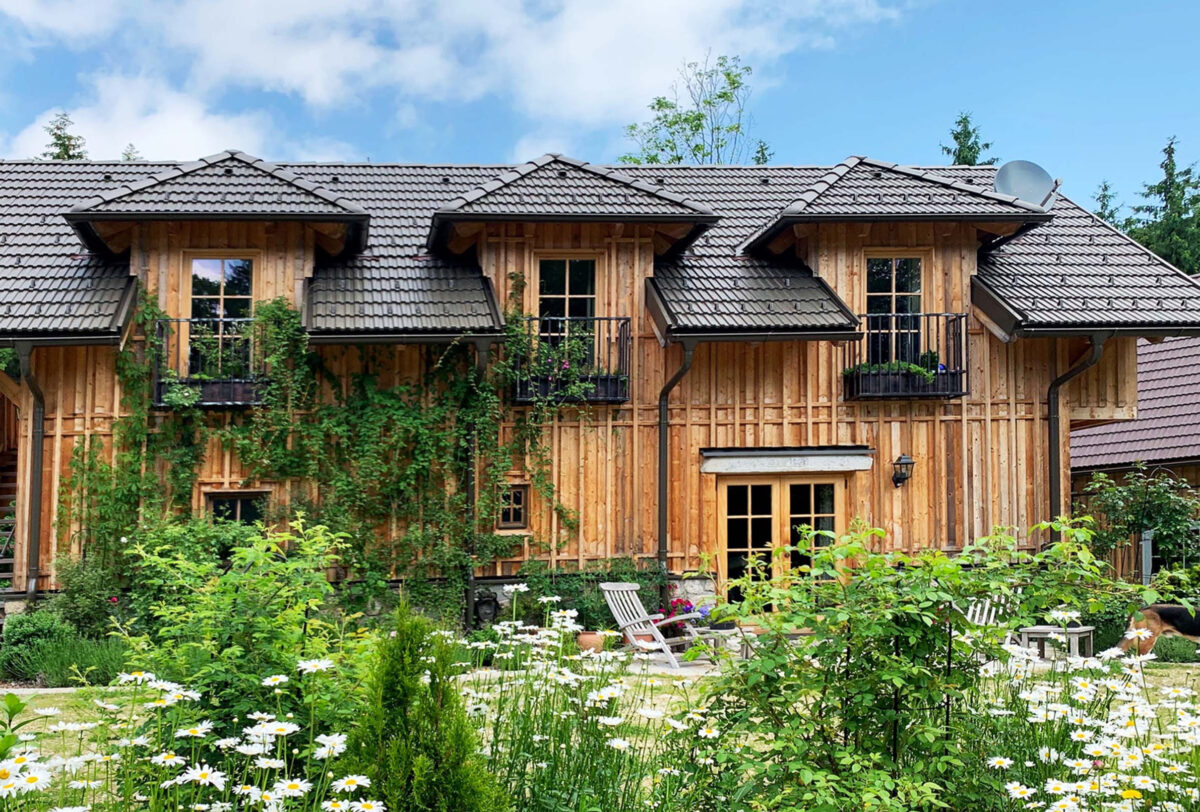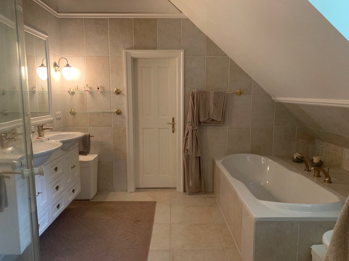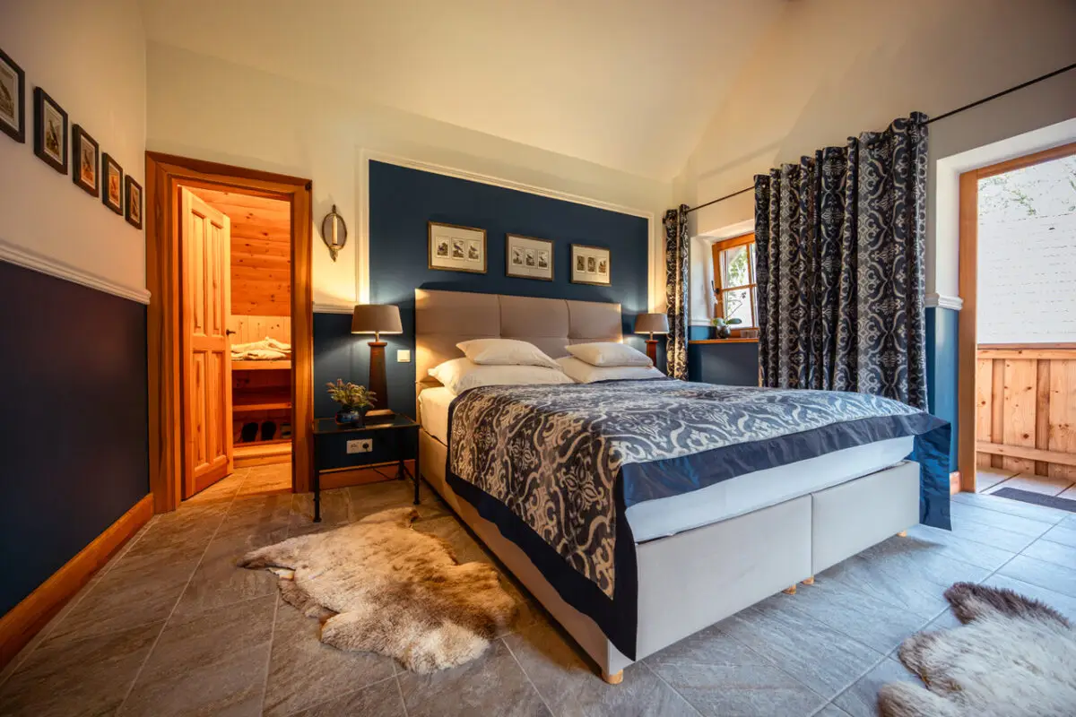 Die 60 m2 Wohnung im ersten Stock des Gästehauses ist eine mit viel Liebe zum Detail eingerichtete Wohlfühloase. In diesem Kleinod ist Entschleunigung kein Versprechen sondern Wirklichkeit. Die Wohnung bietet ein kleines Entrée, eine exclusiv ausgestattete Küche, wie auch ein großzügiges Badezimmer mit Badewanne und Dusche und einen geschmackvollen Wohn-Essraum. Das Schlafzimmer verwöhnt Sie mit einem luxuriösen Bett, indem erholsamer Schlaf garantiert ist. Eine große Garderobe rundet das Ambiente ab. Zwei kleine Balkone laden zum morgendlichen und abendlichen Sonnenbad ein. Im Erdgeschoß des Gästehauses befindet sich ein gemütlicher Wellnessbereich der mit einer Sauna, einem Dampfbad, Infrarot-Tiefenstrahlern, einer Duschkabine, einer Massageliege, Ruhebänken und einer Teeküche ausgestattet ist. Hier können Sie in privater Atmosphäre ungestört wellnessen und sich von der Hektik Ihres Alltages erholen.