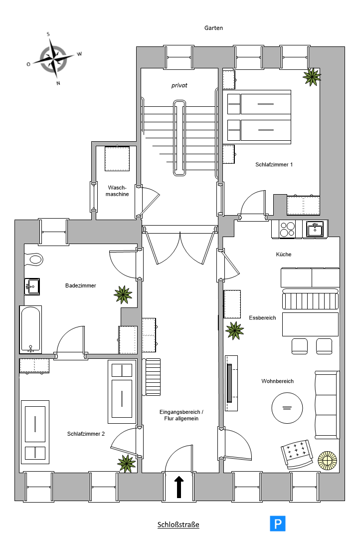 Der große Flur wird gemeinsam mit dem Gastgeber als Ein- bzw. Durchgang genutzt. Alle Ferienräume sind aber separat und abschließbar. Kostenlose öffentliche Parkmöglichkeiten gibt es direkt vor dem Haus an der Straße.