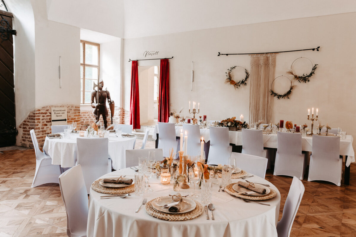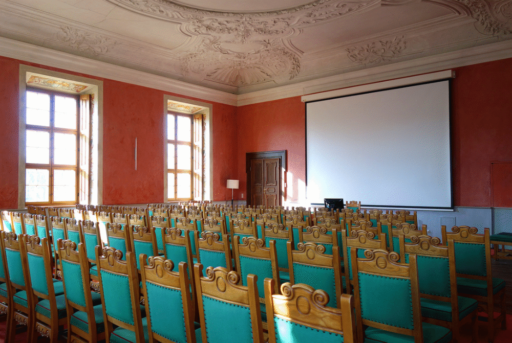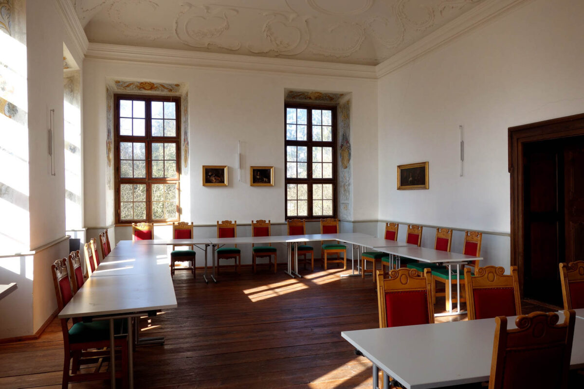 In unserem Schloss bieten wir eine Vielzahl an Sälen und Räumen an. Jeder mit seinem eigenen Charme und Charakter. Der Jupitersaal besticht mit seiner wunderschönen Deckenmalerei. Der Ahnensaal fasziniert mit seiner einzigartigen Decken- & Wandmalerei, die ihresgleichen sucht. Der große Festsaal überzeugt mit seinen hohen Decken und dem besonderen Zauber. Der Marstall ist unser Säulensaal mit 8 imposanten Marmorsäulen. In den beiden Seminarräumen sind noch die alten Fensterrahmenmalereien erhalten, sowie in allen Räumen wunderschöne Stuckaturen. Im ersten Obergeschoß sind zudem noch die Originalböden erhalten.