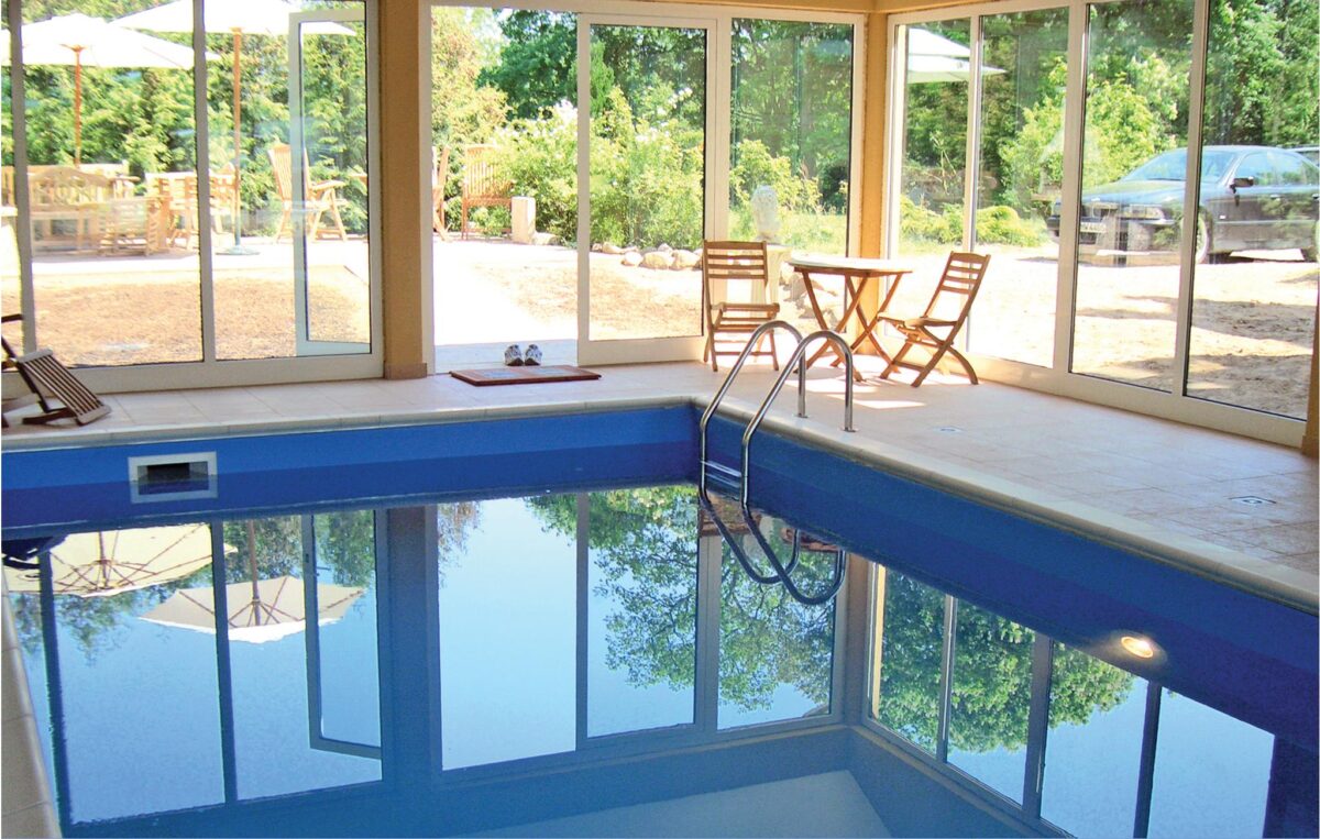 Von hier aus gelangen Sie auch in den großen, privaten, stets beheizten Innen-Swimmingpool mit einer schönen Aussicht in den Garten. Hier steht auch eine Waschmaschine und ein Wäschetrockner zur Ihrer Verfügung.