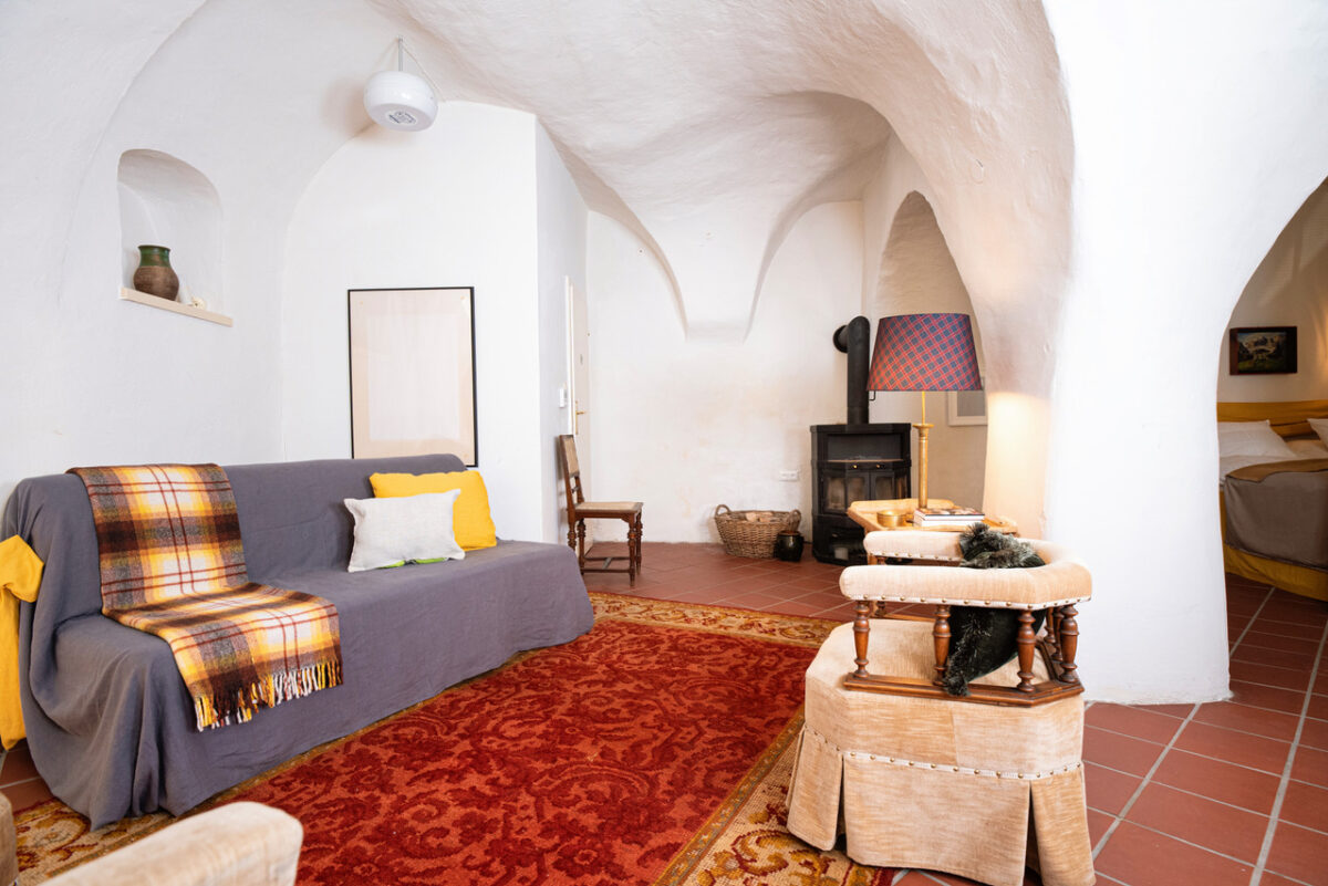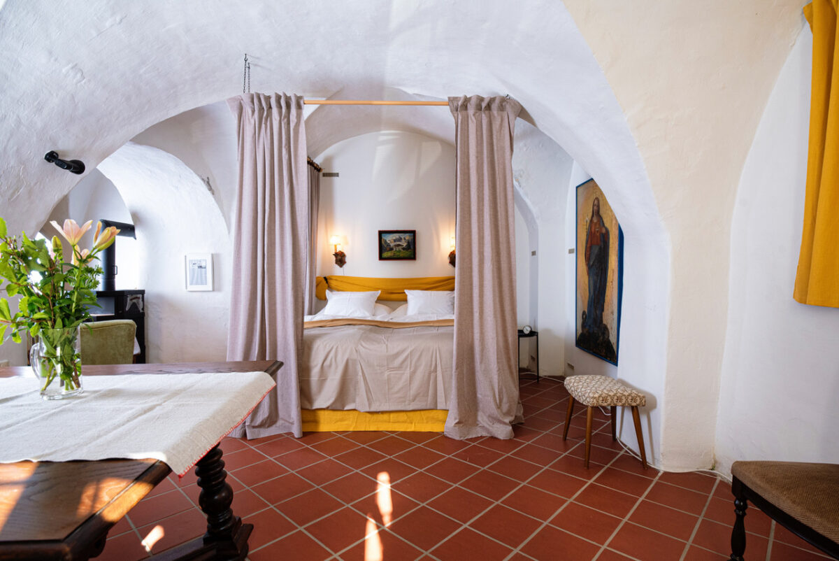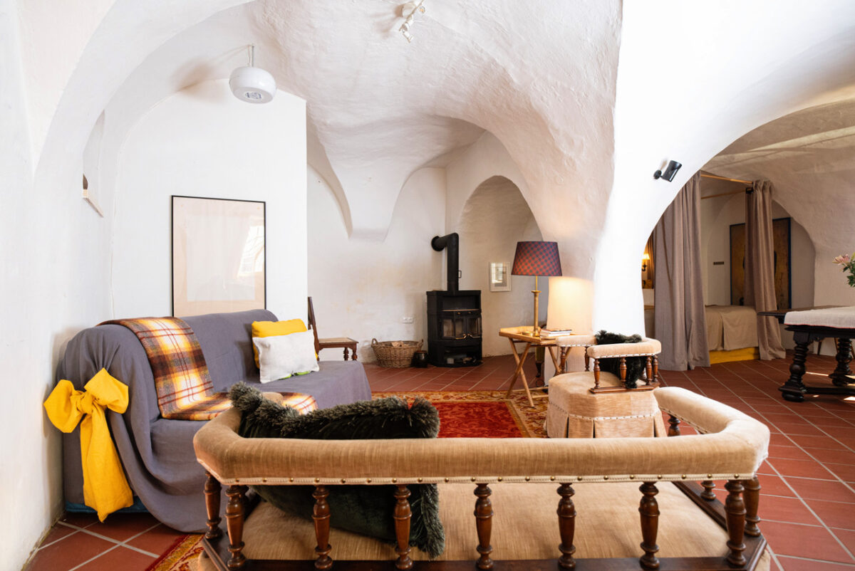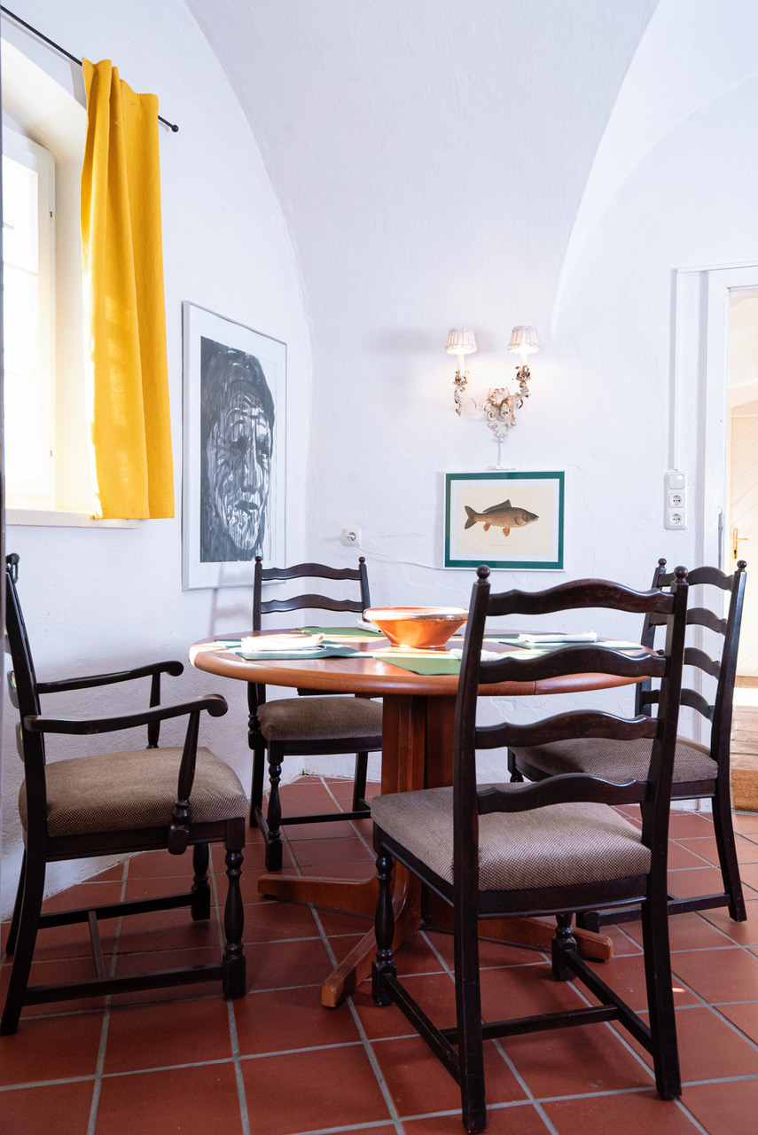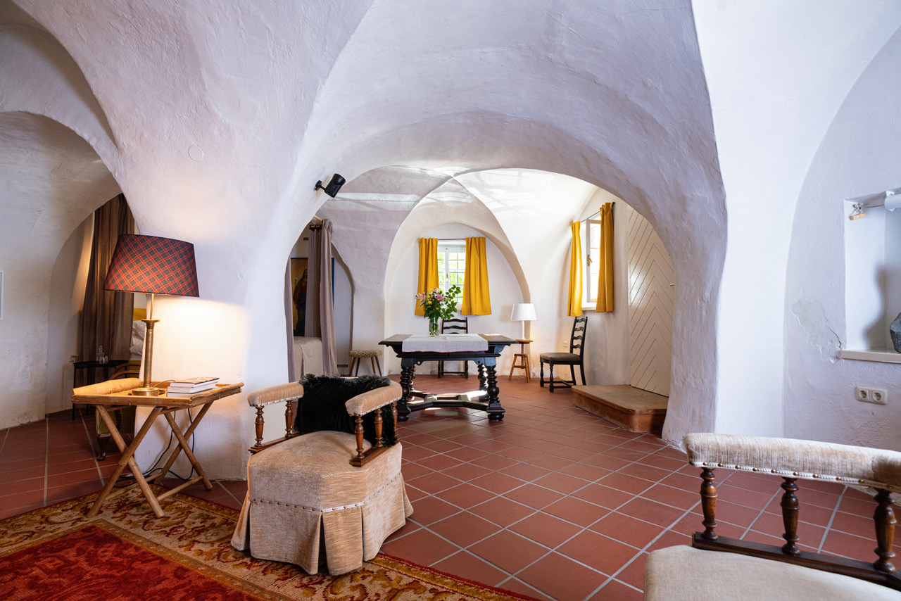 Die alten Gewölbe geben dem Raum einen einmaligen Charakter, der durch moderne Beleuchtung unterstrichen wird. Die Möbel stammen aus Familienbesitz und sind der Atmosphäre des Hauses angepasst.
