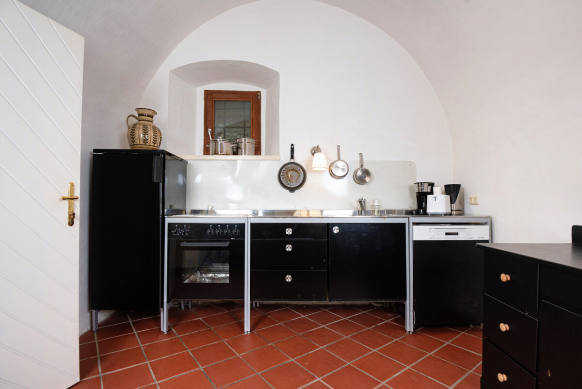 Die moderne Küche hat eine bemerkenswerte Gewölbedecke, unter der ein runder Esstisch zum geselligen Beisammen sein einlädt. Der Wohn- Schlafraum hat mehr als 40 m2 und wird durch eine Mittelsäule unterteilt. Das Badezimmer ist funktional und hat ein Fenster zum Innenhof.