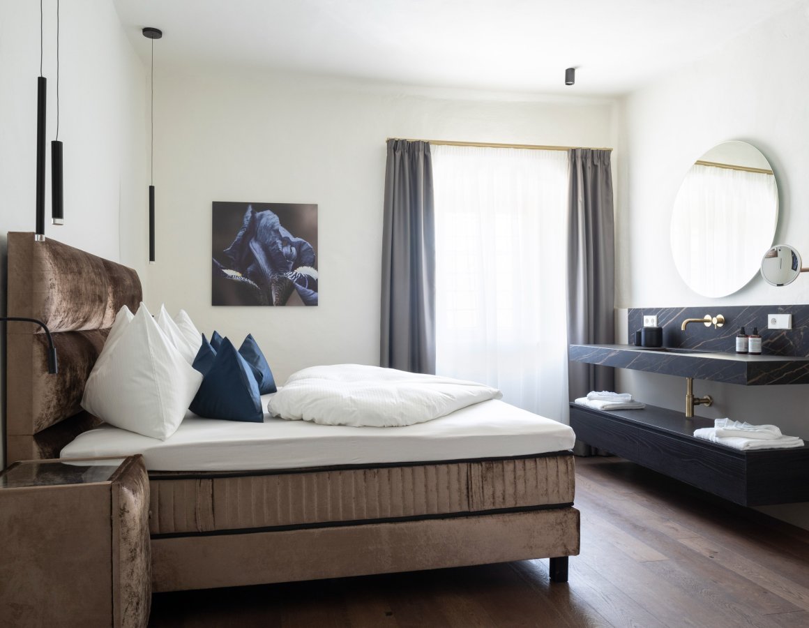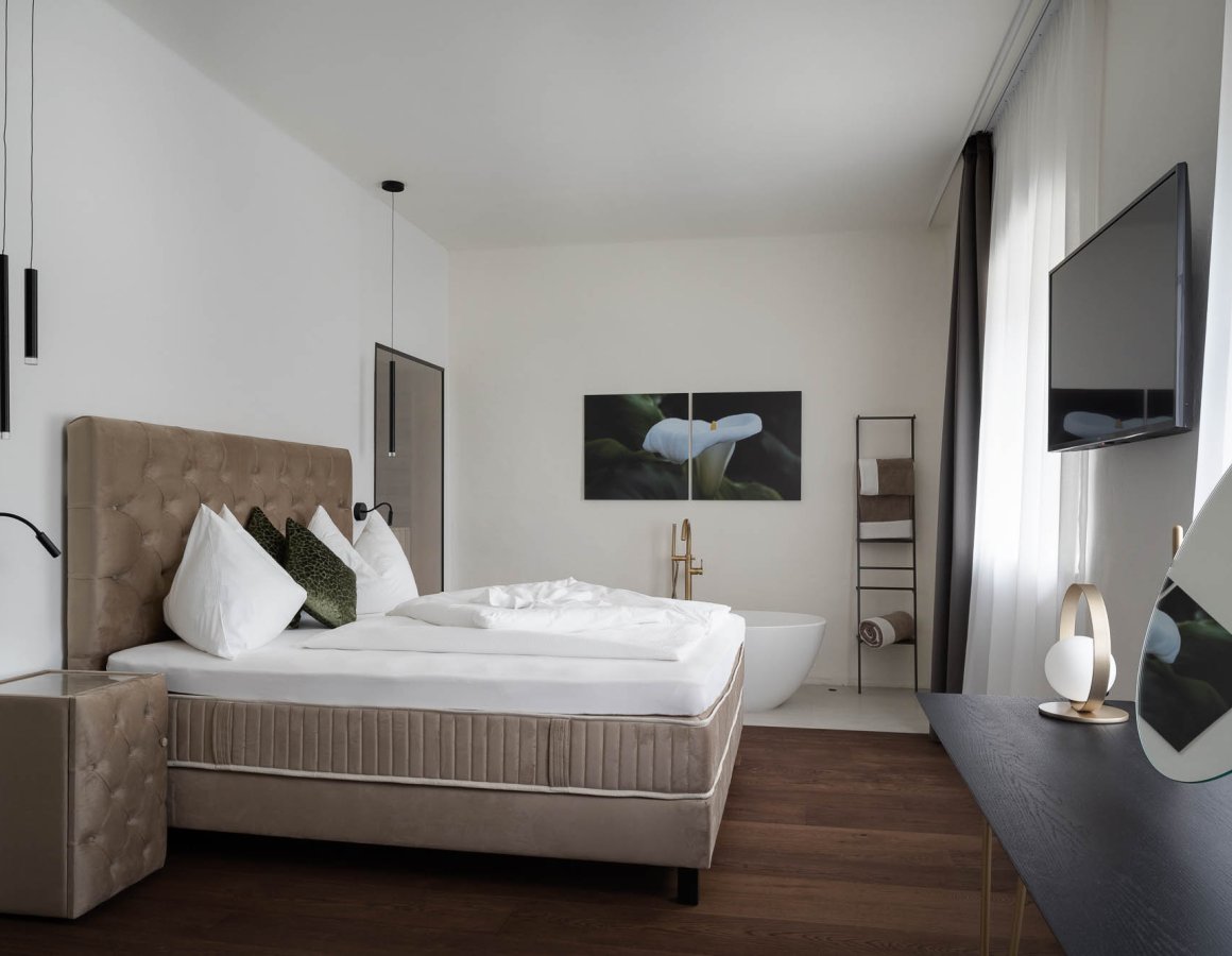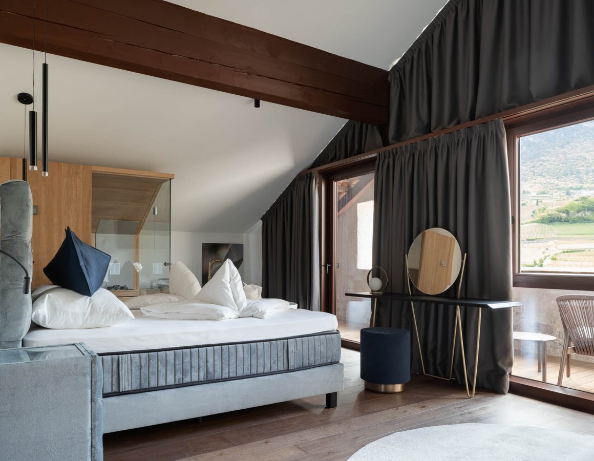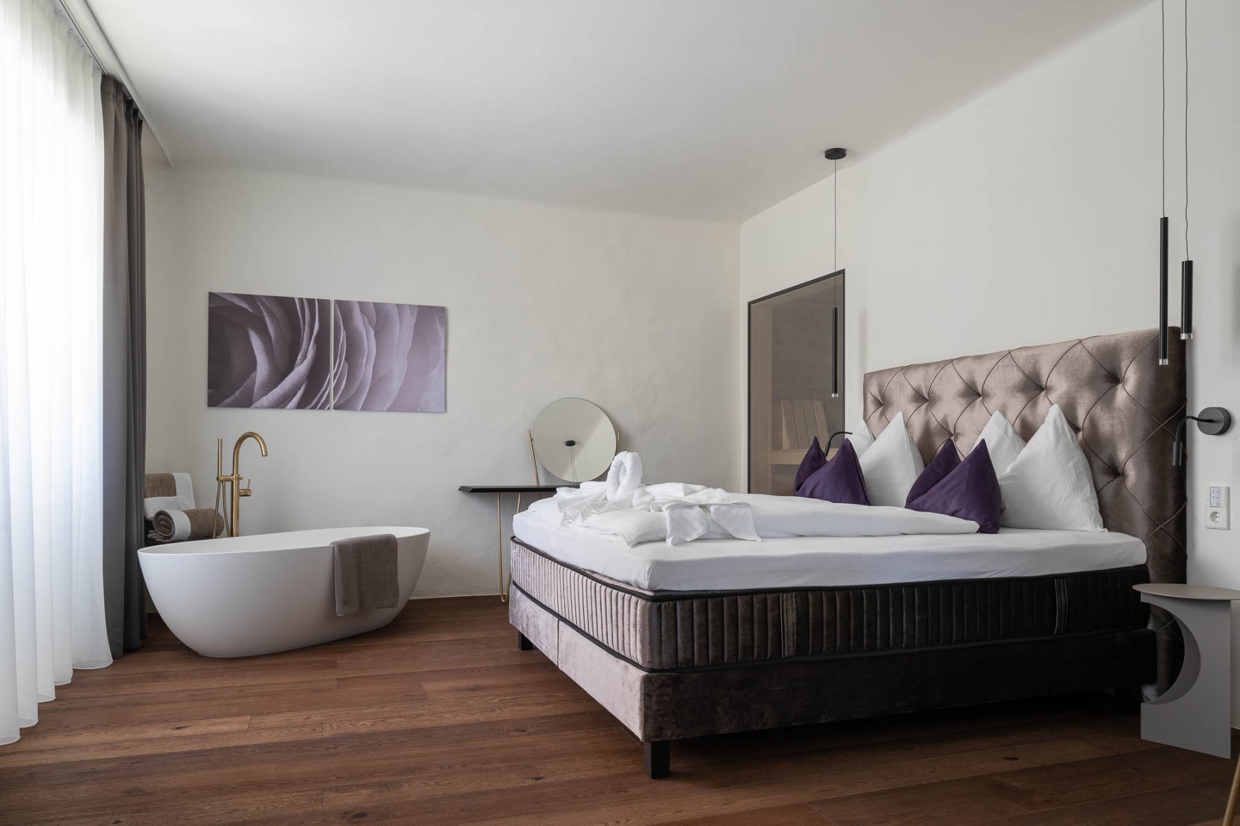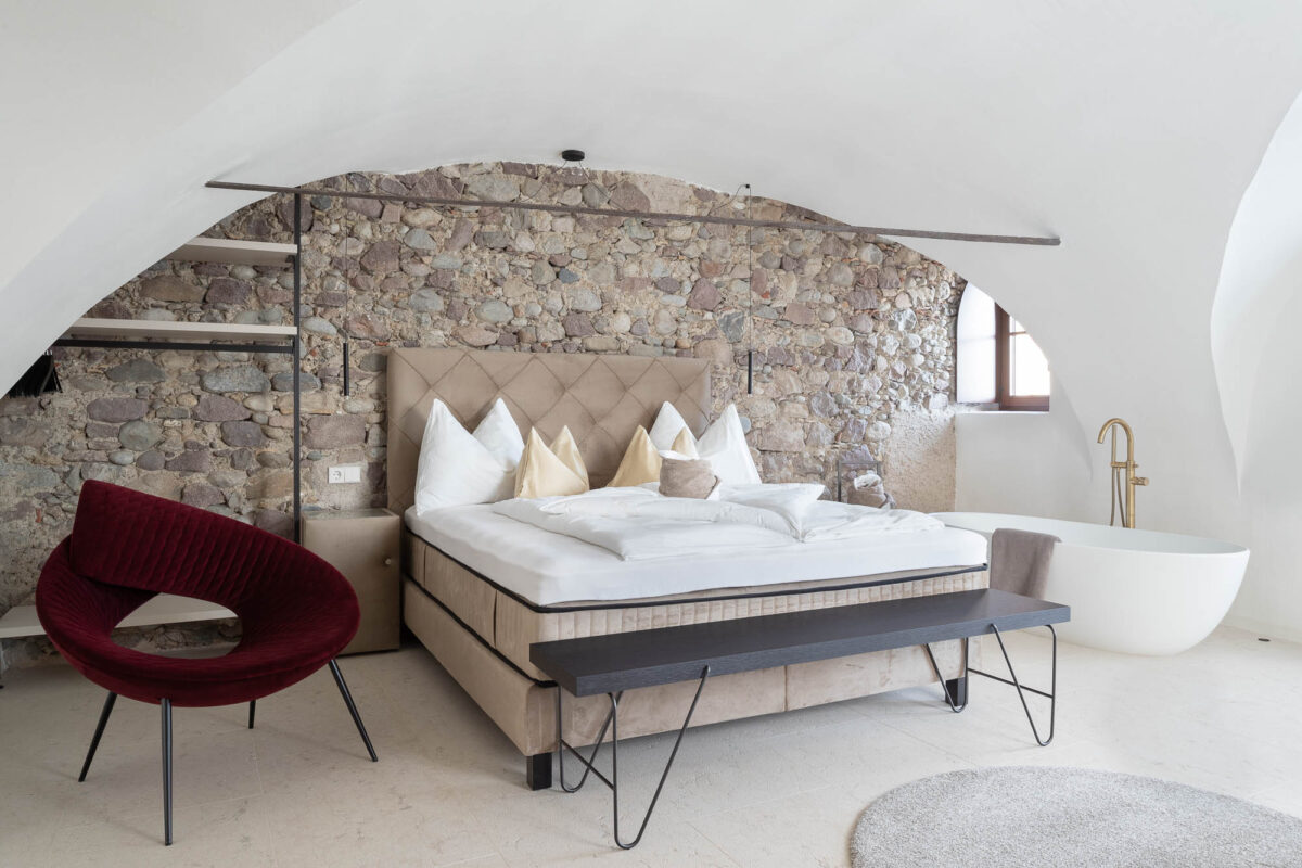 Historischer Charme trifft auf raffinierte Eleganz, Design auf Architektur. Jede der acht Suiten versprüht ihren ganz eigenen Charme. Mal mit freistehender Badewanne und eigener Sauna. Mal mit moderner Küchenzeile oder Weinkühlschrank. Mal mit Balkon/Loggia oder eigenem Garten-Separée auf dem Romantikhügel.
