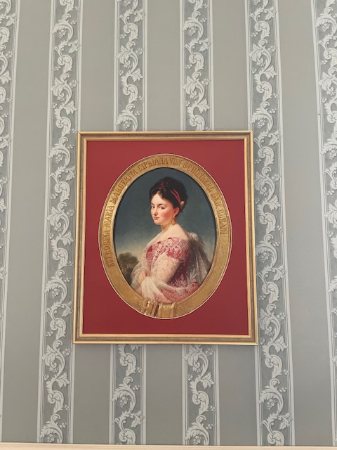 Diese himmelblaue Suite ist eine stilvolle Reminiszenz an die gleichnamige, gebürtige Italienerin, die Ende des 19. Jahrhunderts im Schloss residierte und zahlreiche Räume in ihrer Lieblingsfarbe Himmelblau gestalten ließ – ein Hauch mediterraner Lebensart, der bis heute die Atmosphäre prägt.