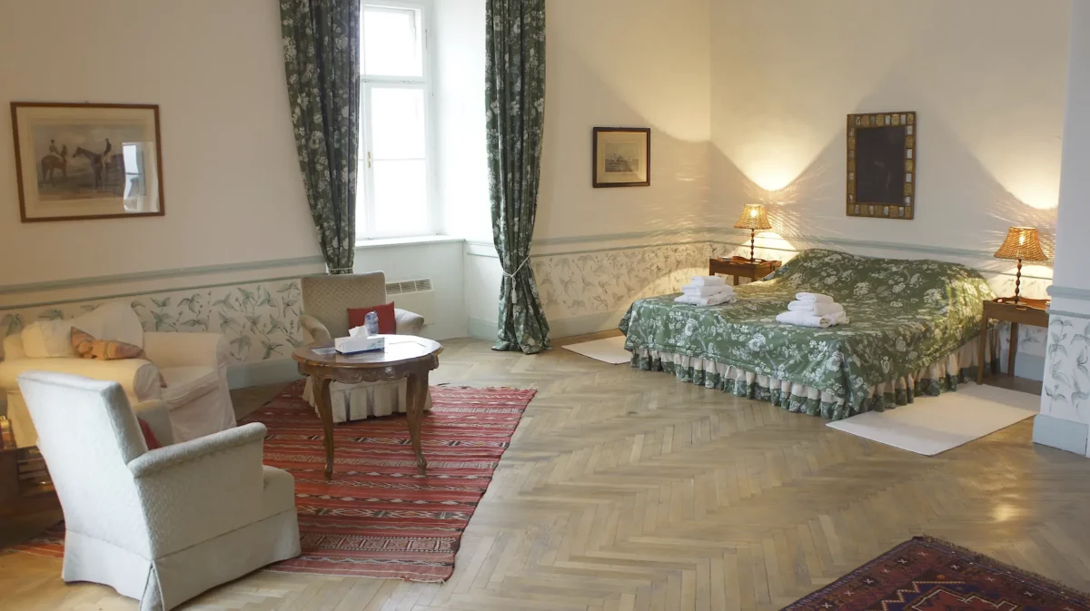 The castle can accommodate up to 20 guests. There are 10 double rooms (up to 13 rooms available upon request), 4 of which have en-suite bathrooms. The remaining 6 double rooms share 3 bathrooms. The rooms are elegantly furnished in an English country style, offering spacious and comfortable accommodations.