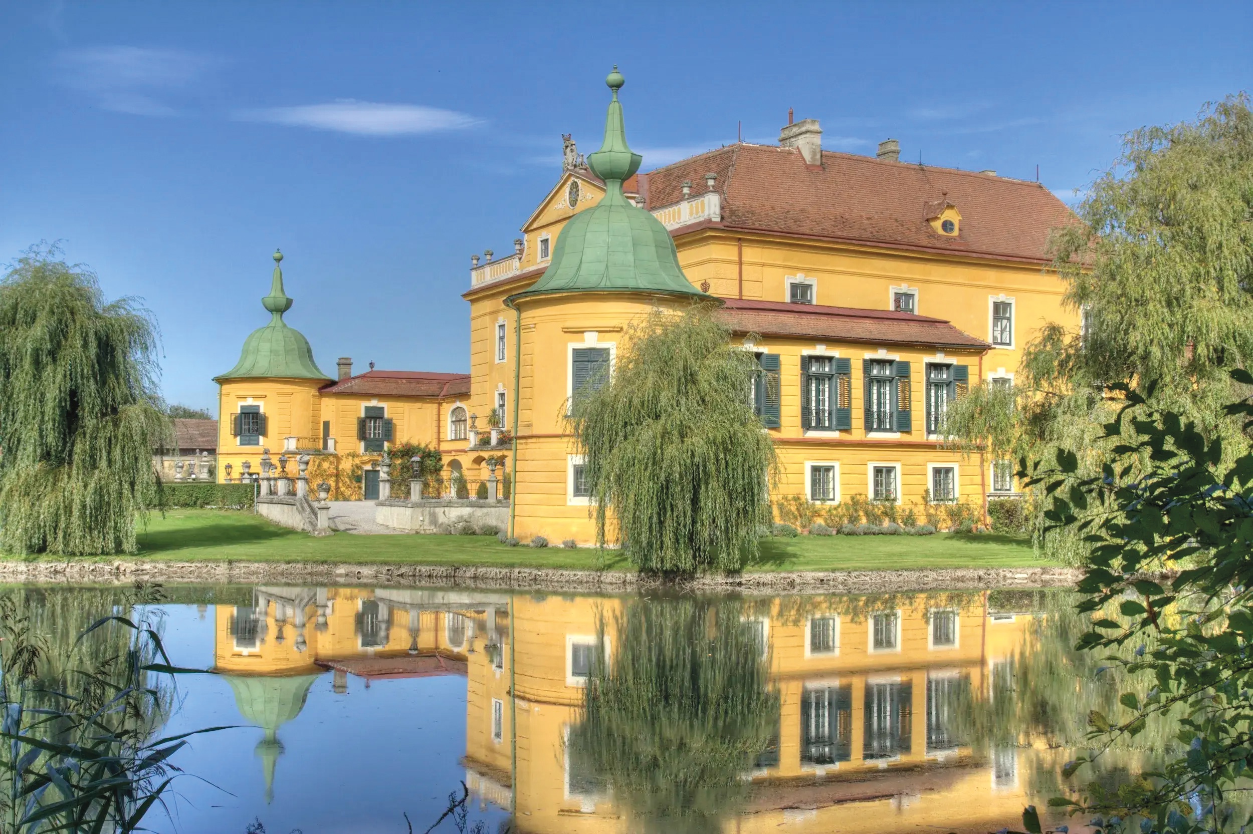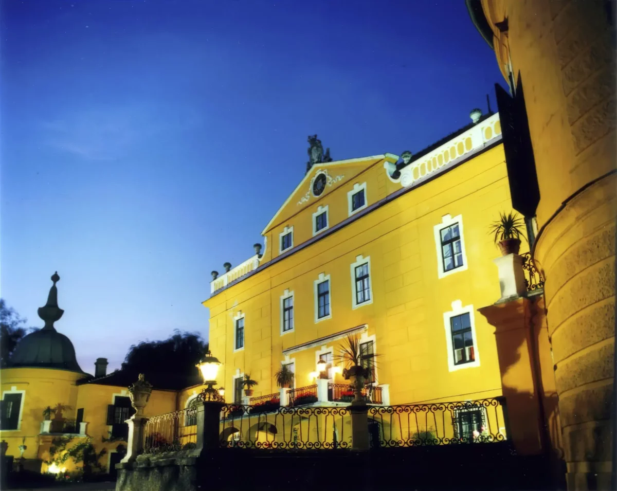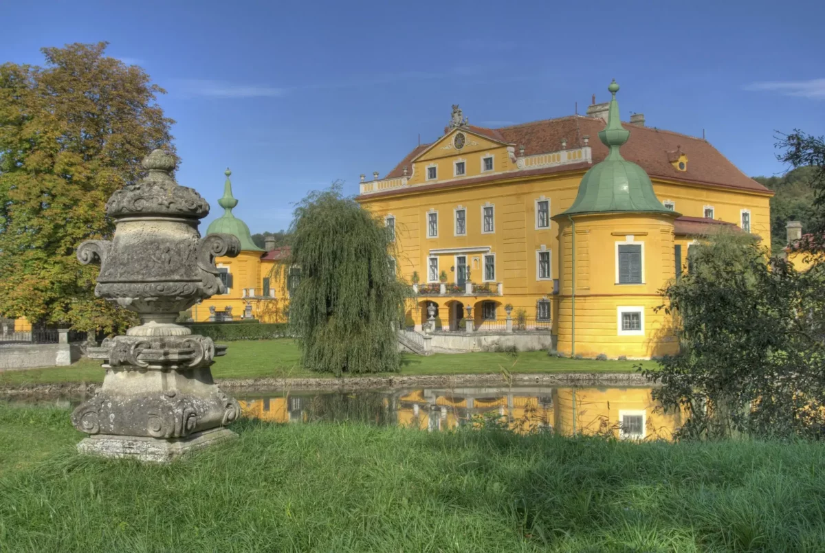 The castle is located 45 km west of Vienna, near the picturesque Danube Valley of Wachau, renowned for its vineyards, monasteries, castles, and charming old villages – perfect for sightseeing tours. Dating back to the 12th century, the castle now presents itself as a romantic Baroque chateau, surrounded by a pond filled with fish, ducks, and other waterfowl. Thoroughbred horses graze in the historic park under ancient trees, which offer numerous romantic picnic spots. The historic stone garden features a large swimming pool (22 x 14 m) with a bathhouse and a sand tennis court. For golf enthusiasts, several beautiful golf courses are nearby.