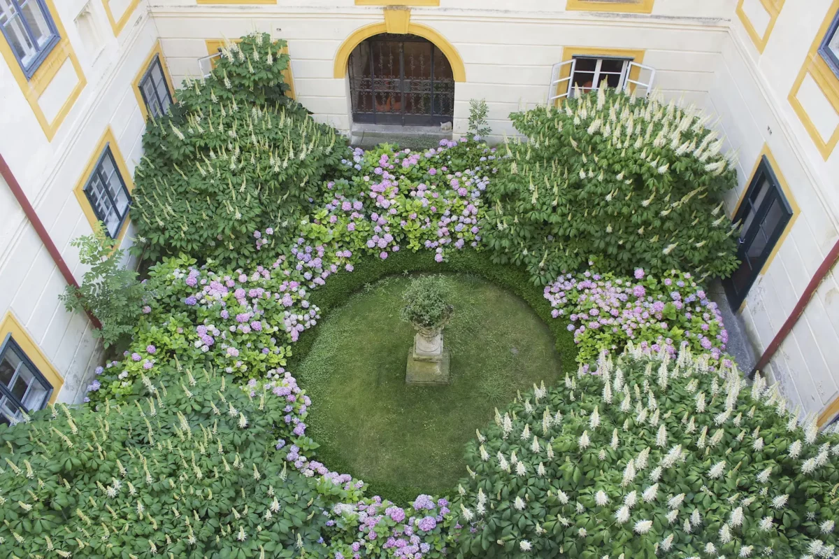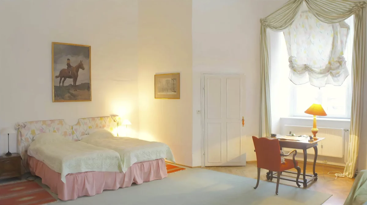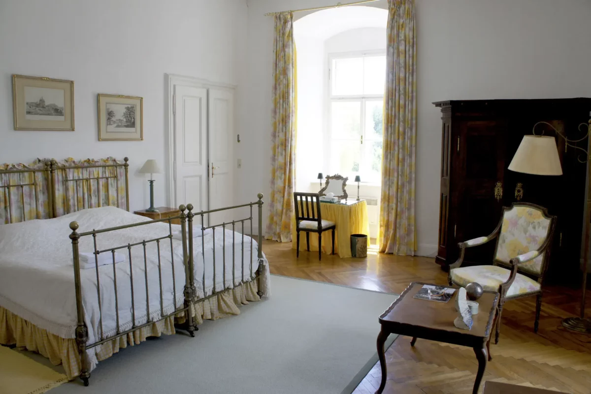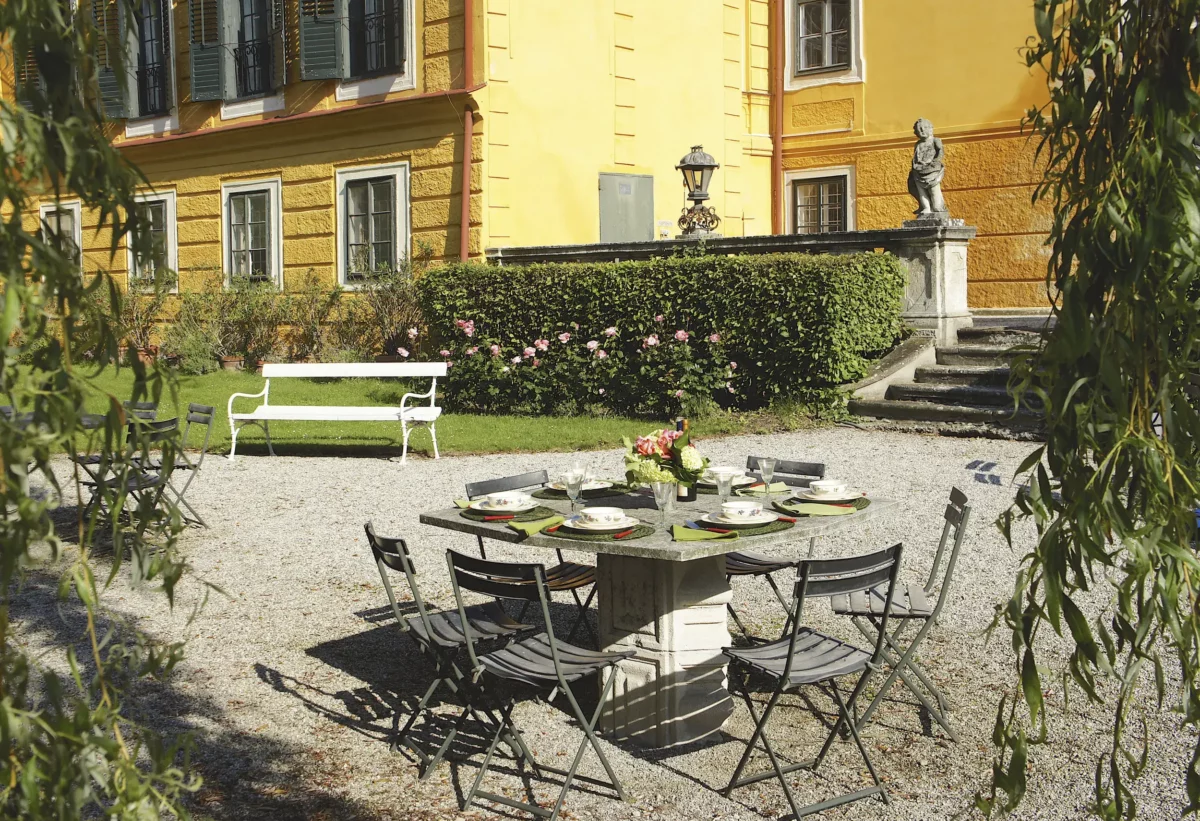 The castle is located 45 km west of Vienna, near the picturesque Danube Valley of Wachau, renowned for its vineyards, monasteries, castles, and charming old villages – perfect for sightseeing tours. Dating back to the 12th century, the castle now presents itself as a romantic Baroque chateau, surrounded by a pond filled with fish, ducks, and other waterfowl. Thoroughbred horses graze in the historic park under ancient trees, which offer numerous romantic picnic spots. The historic stone garden features a large swimming pool (22 x 14 m) with a bathhouse and a sand tennis court. For golf enthusiasts, several beautiful golf courses are nearby.