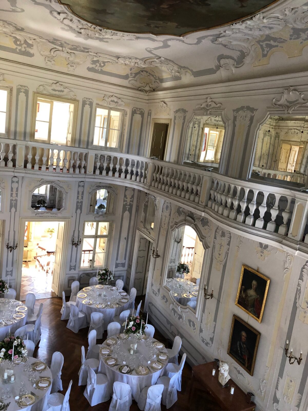 The rococo salon on the first floor and the adjoining salons are unique with their frescoes and rich stucco work and they are as well as the 2nd hall on the ground floor and the other rooms all furnished with antique furniture and pictures to create a fairytale-like ambience.