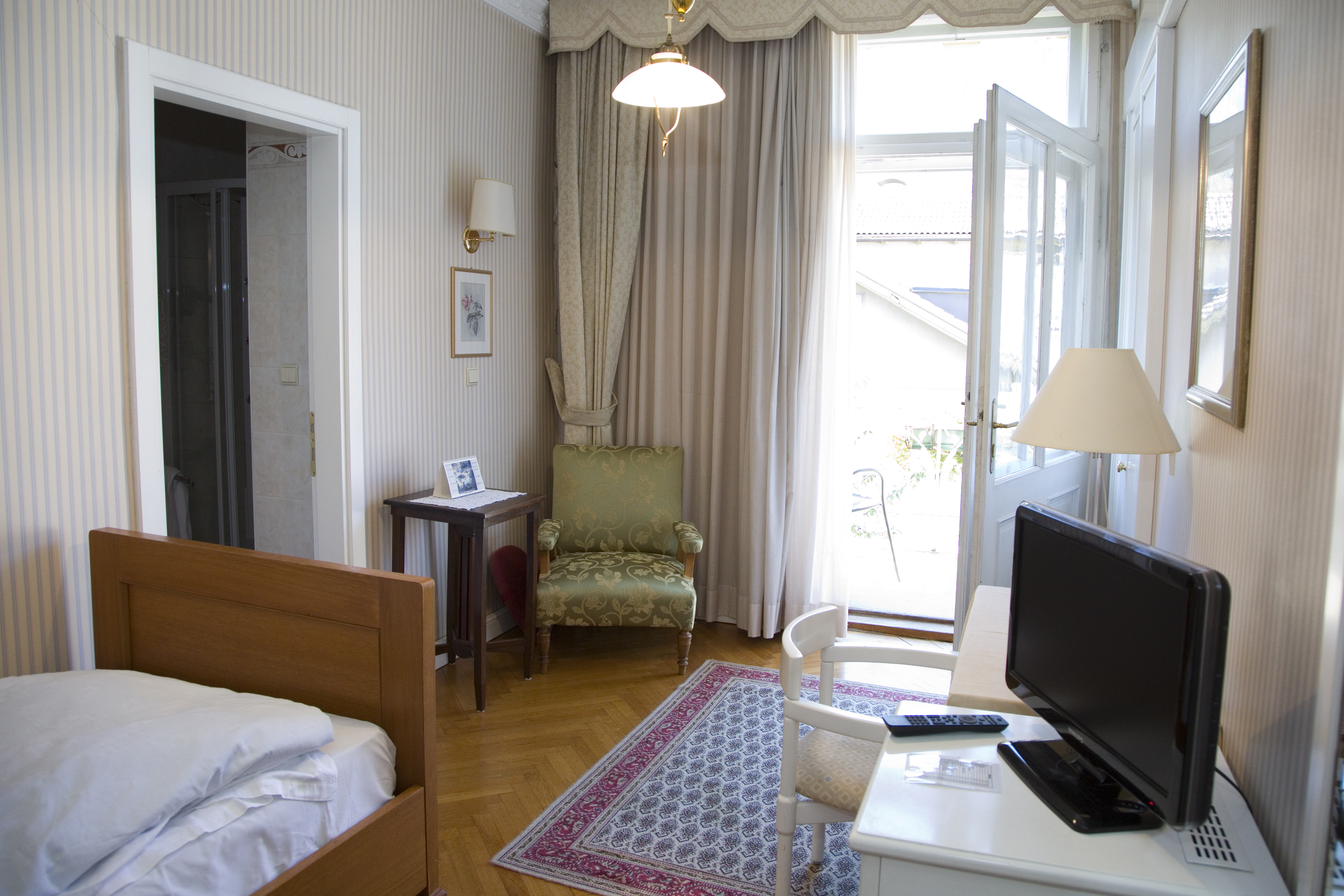 The large and spacious rooms are individually furnished, with each room having its own unique character. They are equipped with a bathroom or shower, WC, hairdryer, radio, satellite TV (with international channels), modern flat-screen TV, direct-dial telephone, and a safe. Most rooms also feature a balcony.
